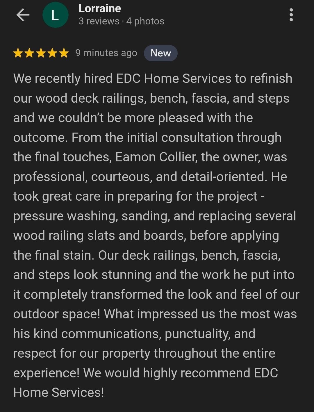 I recently hired EDC Home Services for roof cleaning and pressure washing around lmy property, including the backyard and front yard. Their professinalism was exceptional, and communication was clear and prompt fromstart to infinsh. The results were impressive – the roof and surrounding areas look fantastic. Highly recommend their services for anyone seeking reliable, through, and professional property maintenance.